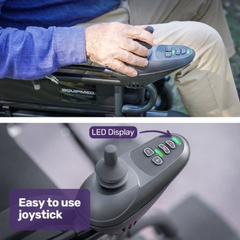 The Equipmed motorised wheelchair is quick to fold. Plus, a sturdy steel frame and easy-to-remove lithium battery mean that it is as light as possible for loading into a car boot or moving into a space-saving storage position.