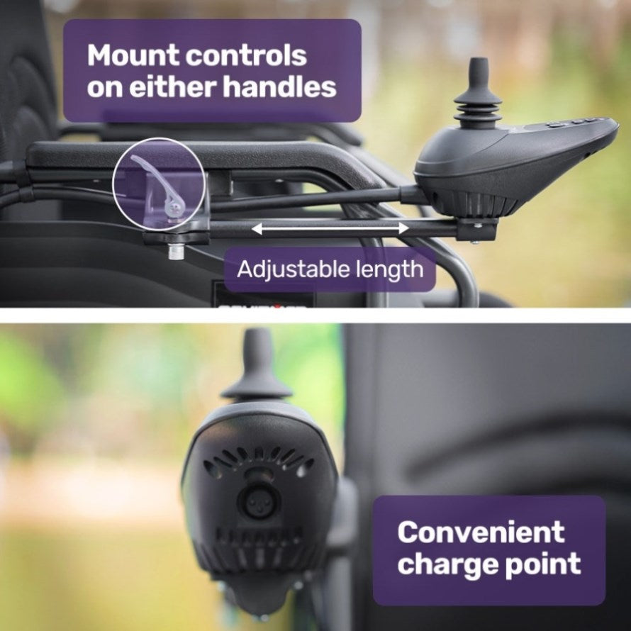 Steering is intuitive using the joystick that can be mounted on either the left or right-hand side, and with easy-to-read LED controls. You can travel along at a sensible speed of up to 6km/h, which is a brisk walking pace.