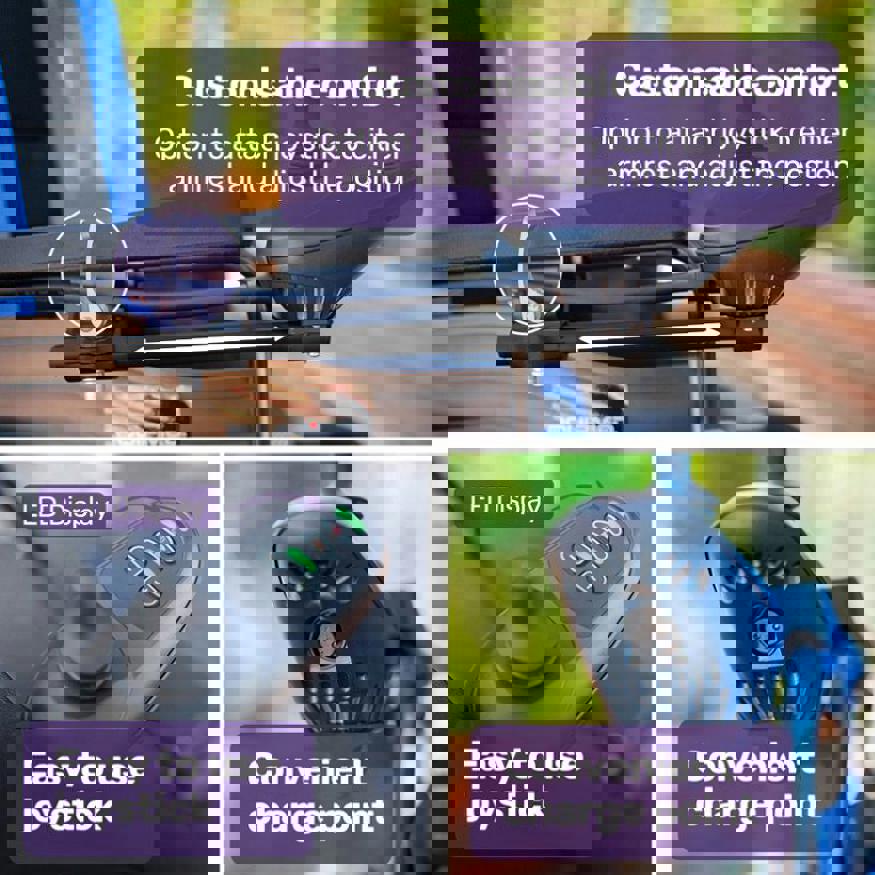 Steering is intuitive using the joystick that can be mounted on either the left or right-hand side, and with easy-to-read LED controls. You can travel along at a sensible speed of up to 6km/h, which is a brisk walking pace.