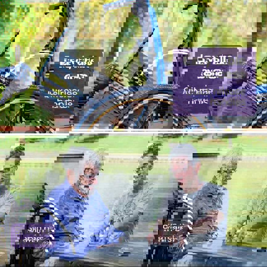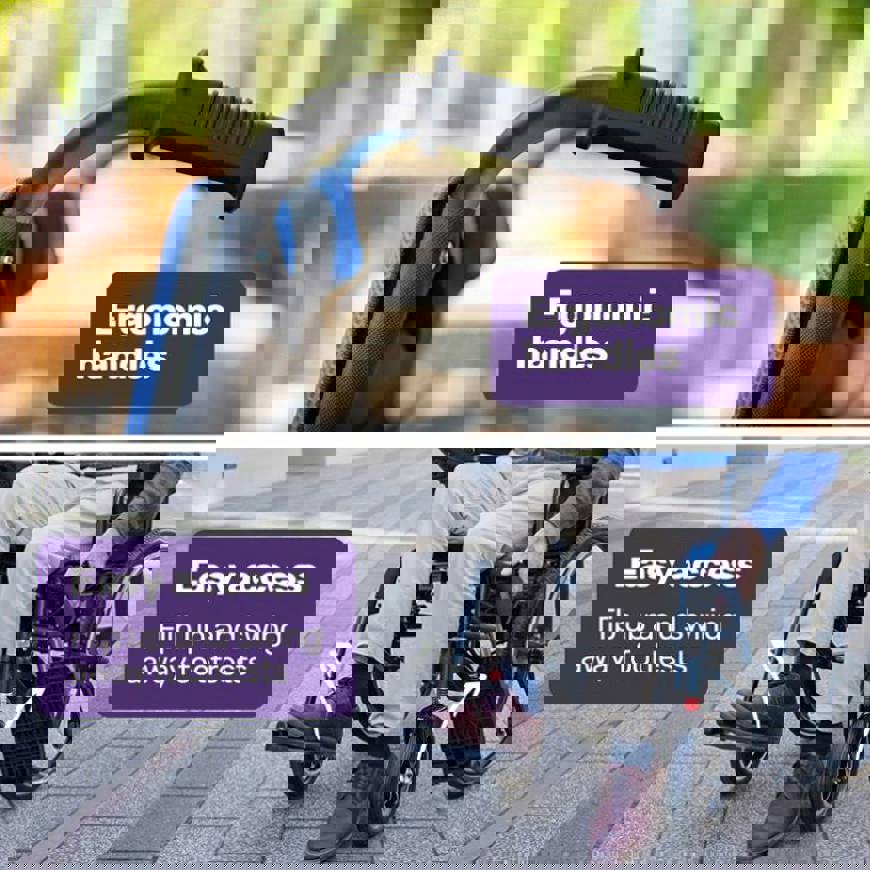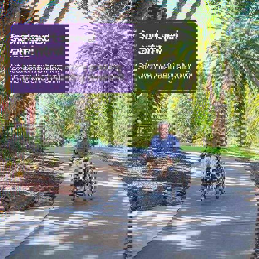 The large rear wheels glide smoothly over the bumps, and the tyres are puncture-proof and never require refilling with air! Theres also a hand rim which gives the option for it to be used as a manual wheelchair.