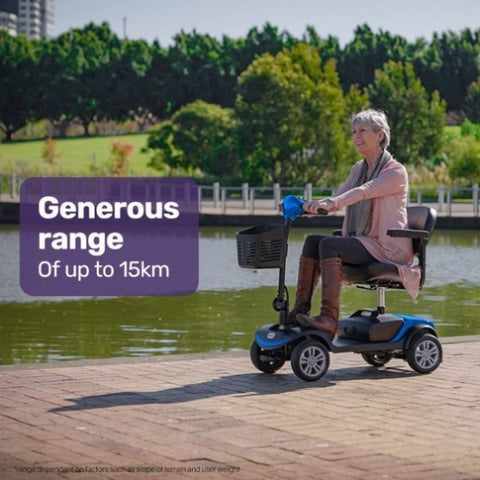 Regain your independence with the FreeRoam+ Mobility Scooter from Equipmed. Whether youre using it yourself or assisting someone, the controls are straightforward, and rear suspension ensures a smooth ride. It reaches up to 8km/h with a range of 12-15km, perfect for everyday outings. The Flat-Free tyres are a bonus, meaning no need to worry about maintaining tyre pressure.