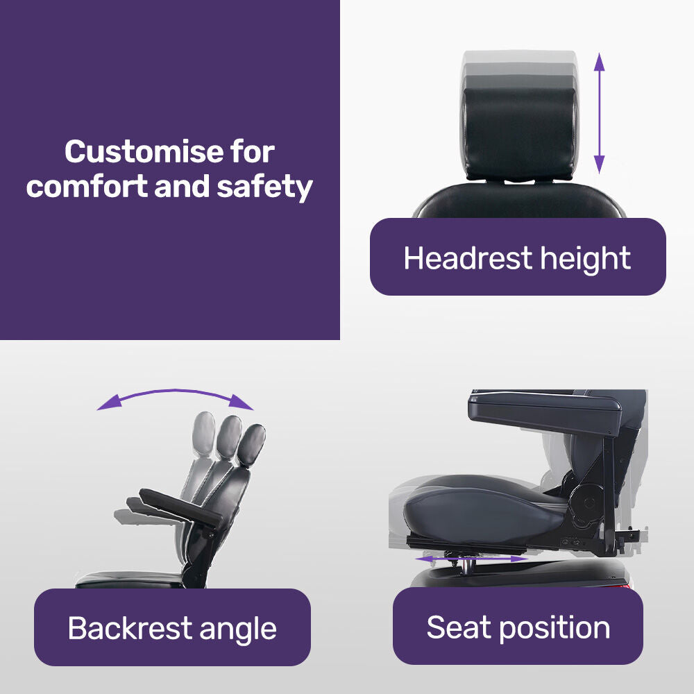 This sturdy XXXL-sized model offers a smooth, stable ride designed for comfort. With adjustable armrest width, headrest height, and seat position, you can personalise your fit for ultimate support and relaxation. Thick, cushioned padding on both the seat and armrests makes every journey a pleasureperfect for all-day use.