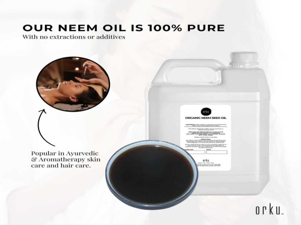Orku Organic Neem Seed Oil is 100% pure, cold pressed de-bitterised oil with no extractions or additives. It is naturally rich in Vitamin E, contains natural organic Sulphur, proteins, vitamins, glycerine and other trace elements.