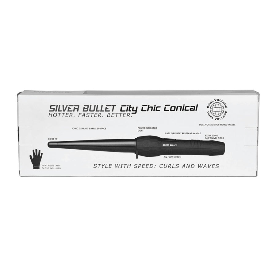 The Silver Bullet City Chic Large Conical Curling Iron means fast style! With instant heat up, you'll be styling quicker than ever before. A professional yet amazingly affordable conical curler with ionic ceramic surface barrel which creates smooth, shiny curls. Ideal for all hair types to create a variety of curls from ringlets to soft looping curls. Dual voltage for worldwide use.