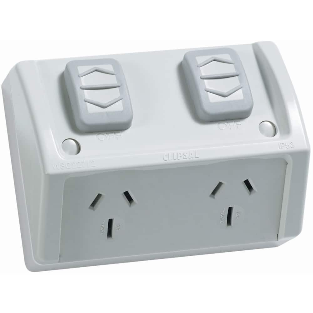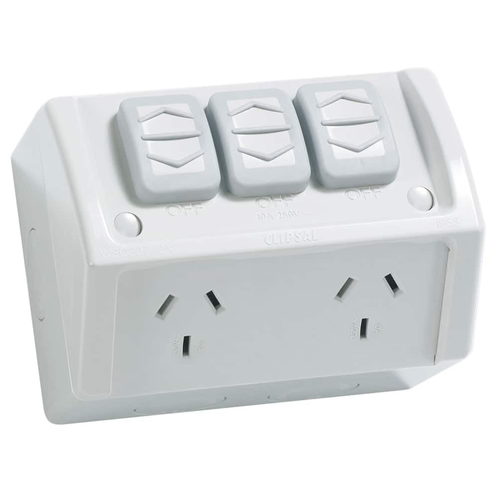 Clipsal Weathershield 10A 250V Twin Switch Socket Outlet with Extra Switch is made of high-quality plastic. 1 x 20 mm Screwed entry, 2 x 20 mm flash out entries. Easy access to screw for quick termination of cable, quick and easy to install. Control type: sliding type, ON/OFF button, Number of gangs: 2 gangs, Pin number: 3, Number of power socket outlets: 2, Fixing mode: by screws.