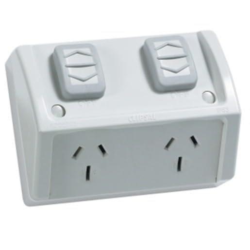 Clipsal Weathershield 10A 250V Flush Mount Twin Switch Socket Outlet is made of high-quality plastic. Easy access to screw for quick termination of cable, quick and easy to install. Control type: sliding type, ON/OFF button, Number of gangs: 2 gangs, Pin number: 3, Number of power socket outlets: 2, Fixing mode: by screws.