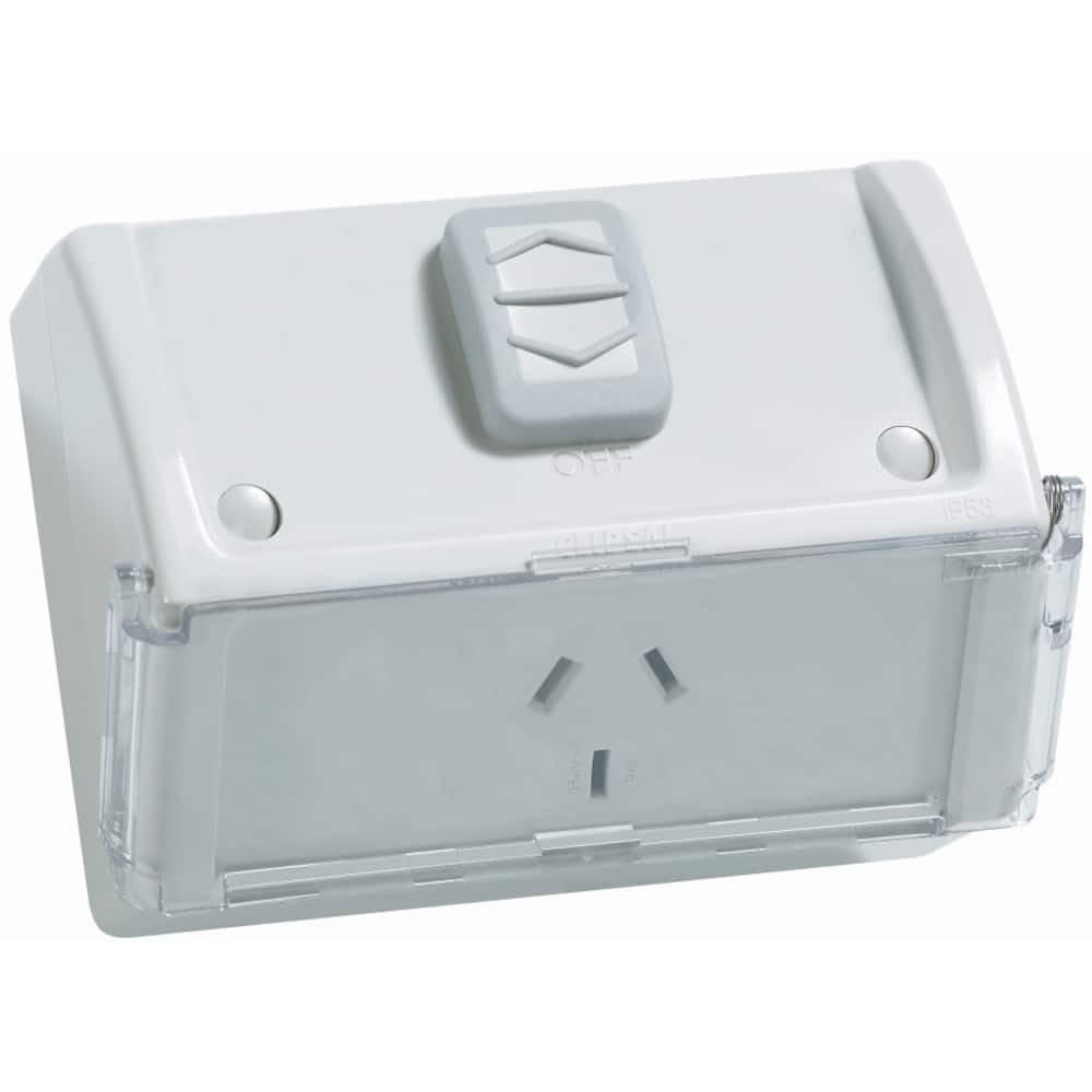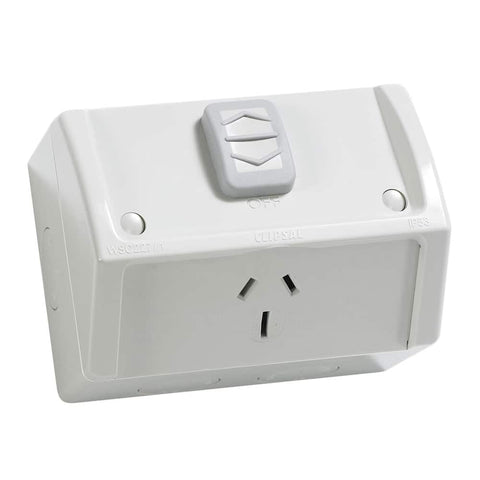 Clipsal Weathershield 15A 250V Single Switch Socket Outlet is made of high-quality plastic. 1 x 20 mm Screwed entry, 2 x 20 mm flash out entries. Easy access to screw for quick termination of cable, quick and easy to install. Control type: sliding type, ON/OFF button, Pin number: 3, Number of power socket outlets: 1, Fixing mode: by screws.