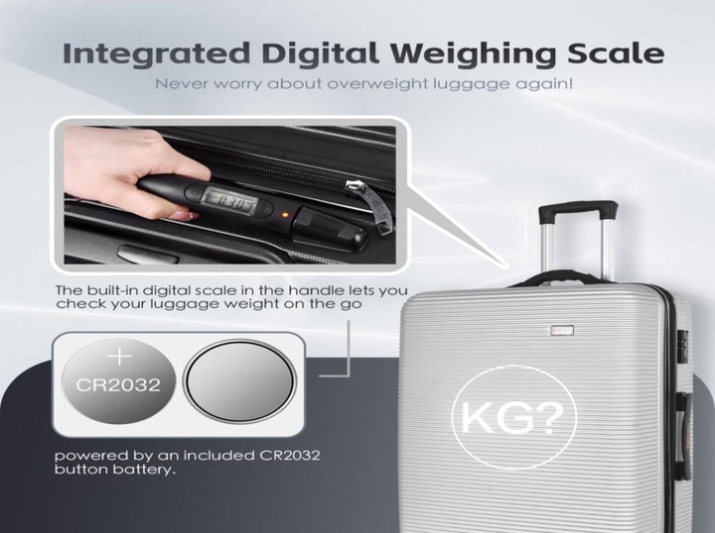 Integrated Digital Weighing Scale: Check your luggage weight on the go with the built-in digital scale in the handle. Powered by a CR2032 button battery (included).