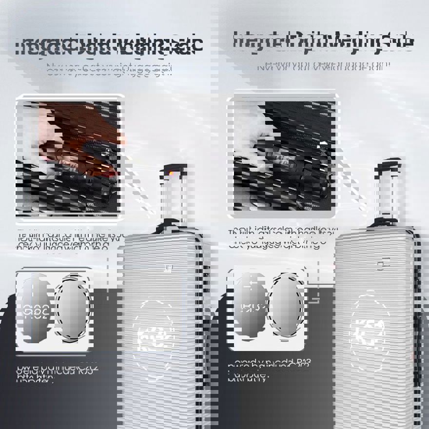 Integrated Digital Weighing Scale: Check your luggage weight on the go with the built-in digital scale in the handle. Powered by a CR2032 button battery (included).