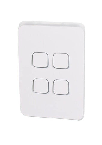 Clipsal 3000 Series 4 Gang, 250V, 10Ax1-Way/2-Way Vertical Mount Iconic Flush Switch is a versatile 3 gang smart light switch assembly with 2-way functionality. This flush-mounted Clipsal 3 gang switch is great for residential use, and ideal for large spaces and staircases. O rings prevent screws dislodging during transportation. Protective flaps help prevent direct access to the screws after installation. Specifications: Range: Clipsal Iconic; Product or component type: switch; Device application: lighting; Colour tint: vivid white; Sustainable offer status: Green Premium product; Load type: fluorescent 10 A; LEDi lamp 100 W; Quantity per set: set of 20; Device presentation: complete product; Control type: rocker; Device mounting: flush; Installation direction: vertical; Switch function: 1-pole 1/2-way; Number of rocker: 4; Rated current: 10 A; rated operational voltage: 250 V; Height: 120 mm; Width: 78 mm; Depth: 39 mm; Net weight: 0.124 kg; REACh Regulation: Reference contains Substances of Very High Concern above the threshold; EU RoHS Directive: Compliant; Mercury free: Yes; RoHS exemption information: Yes; China RoHS Regulation: Product out of China RoHS scope. Substance declaration for your information; Environmental Disclosure: ENVPEP1607003EN; Material: plastic.