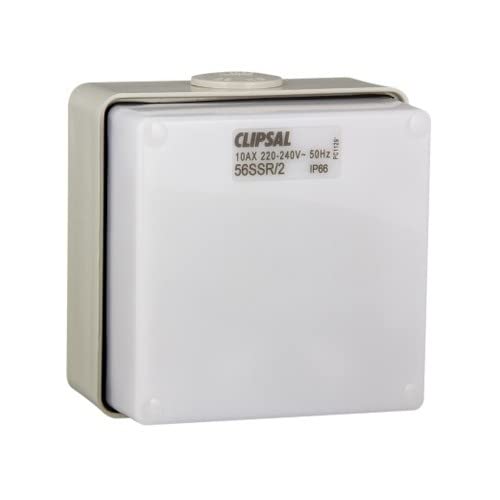 Clipsal 56 Series 2-Wire 240V AC 10A Sunset Switch high visibility yellow enclosure with blue switch. Spring loaded socket flap with latch for added safety coverage. OFF ON marking is raised to ensure marking never wears off. Padlocking facility (8mm) in OFF position. Optional safety interlock facility. External and accessible mounting facilities.