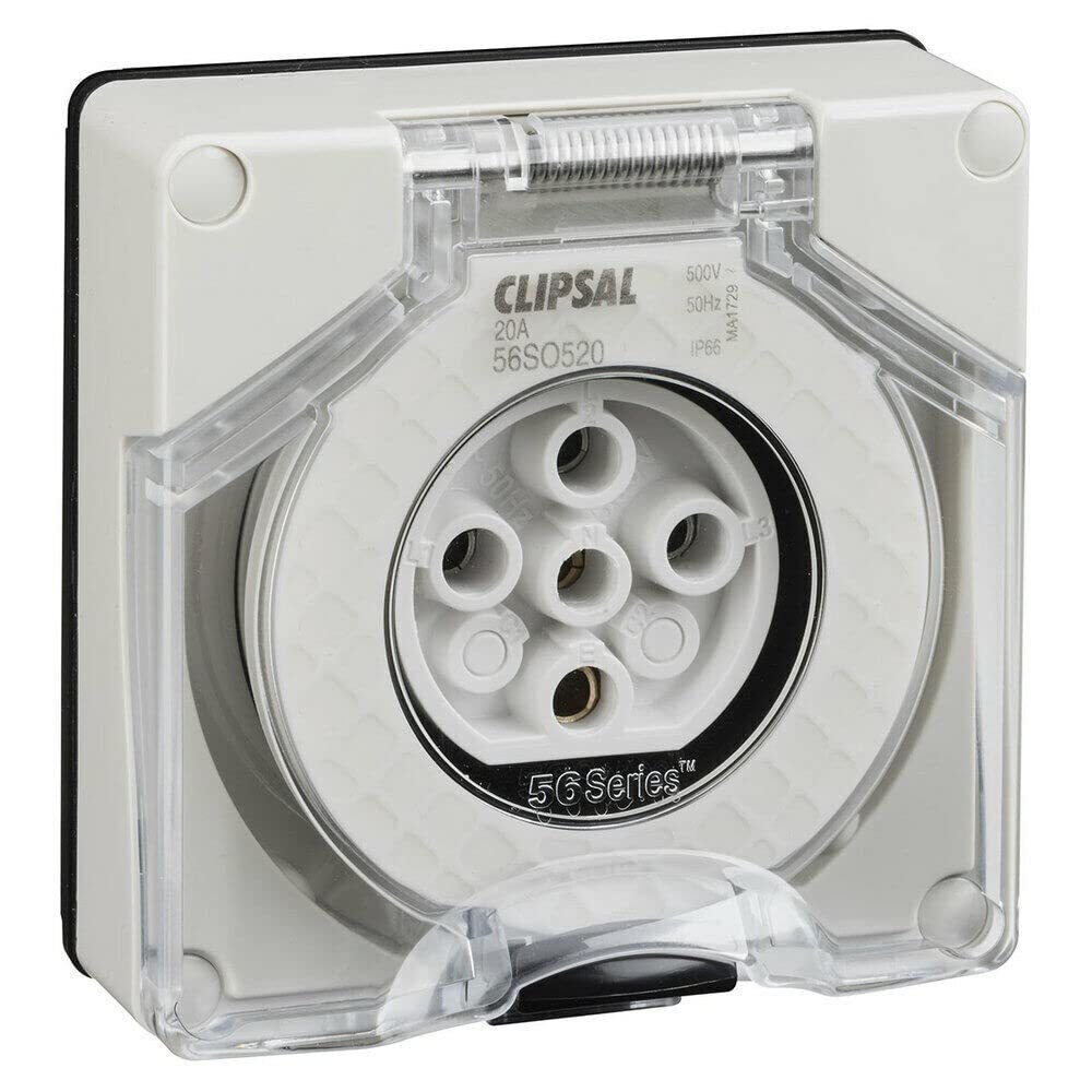 Clipsal 56 Series 500V 20A 5 Pin Round Less Enclosure Surface Socket Outlet is the most commonly used type of socket in domestic settings. Switched sockets are those with switches on which need to be switched on in order for the electrical supply to feed to your devices. With backed out captive screws, making it incredibly easy to install and to connect the wires. Socket has a lightly lacquered surface to reduce fingerprint marks, always maintaining its sleek profile.