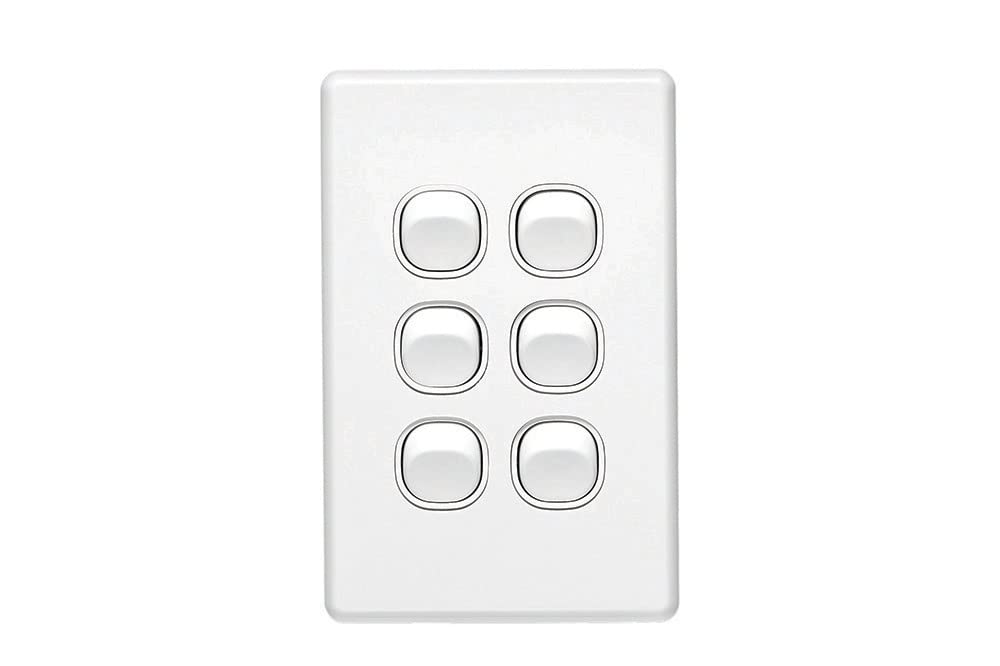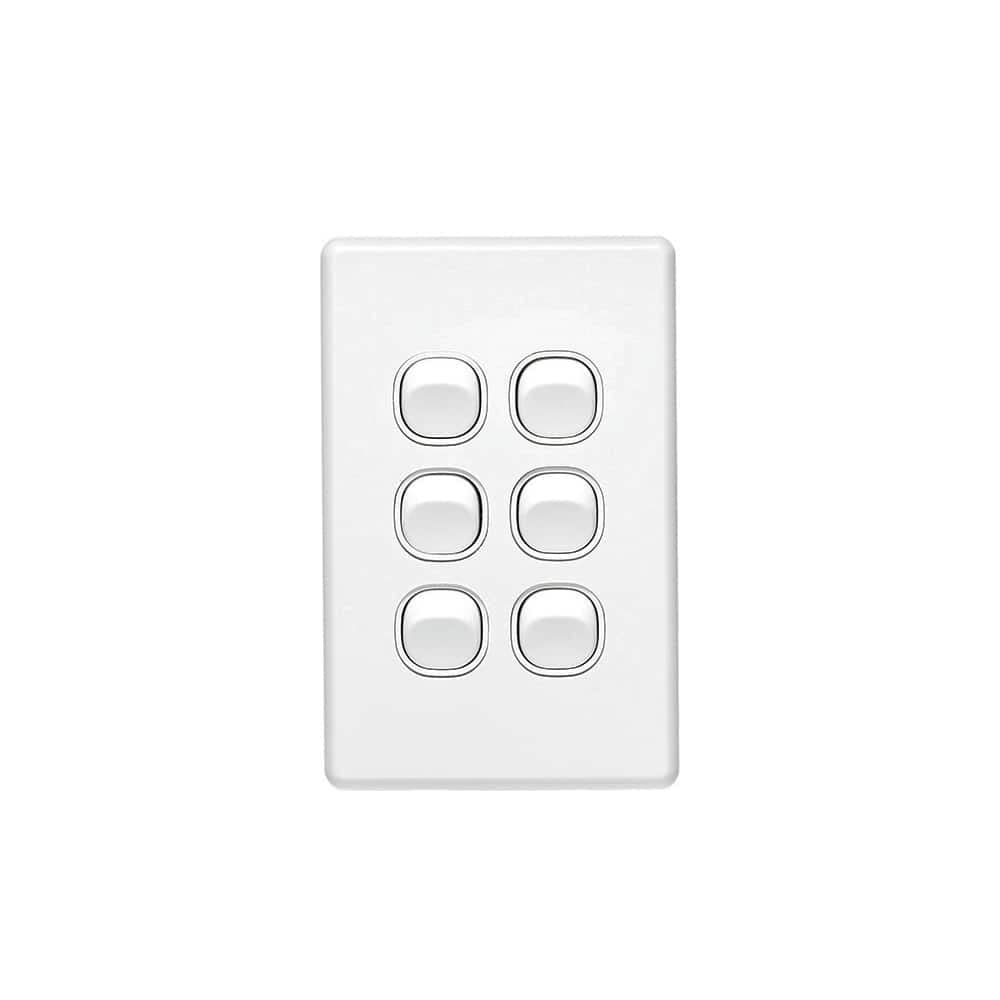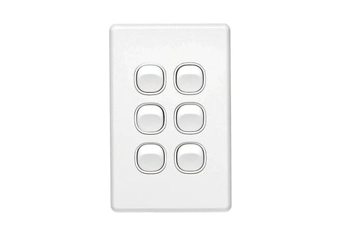 Clipsal C2000 Series 10A Switch 6 Gang Vertical Flush Switch is fine line product at only 6.5 mm thick. This is for contractors requiring a modern and contemporary minimalistic design. It is manufactured from virgin polycarbonate material. This is so it won’t fade or yellow over time. The switch mechanisms allow for two way switching and are rated at 250V AC 10AX. Composite silver nickel switch contacts. Comes in white electric colour.
