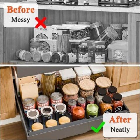 • EXPANDABLE DESIGN FOR PERFECT FIT: Easily adjust the width of each pull-out drawer to fit cabinets from 32 cm to 52 cm. This flexible design maximizes cabinet space in kitchens, pantries, bathrooms, and more—no more wasted corners or unreachable items.