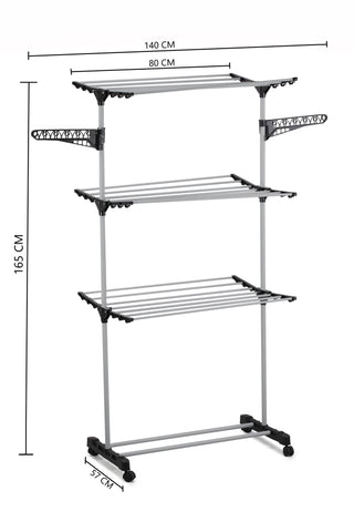 - LARGE CAPACITY: This 3-Tier Folding Clothes Drying Rack features an overall dimension of 165 x 140 x 57 cm and a 3-tier construction with 6 foldable shelves, 2 side wings with 7 holes for hanging and drying different clothes easily and conveniently.