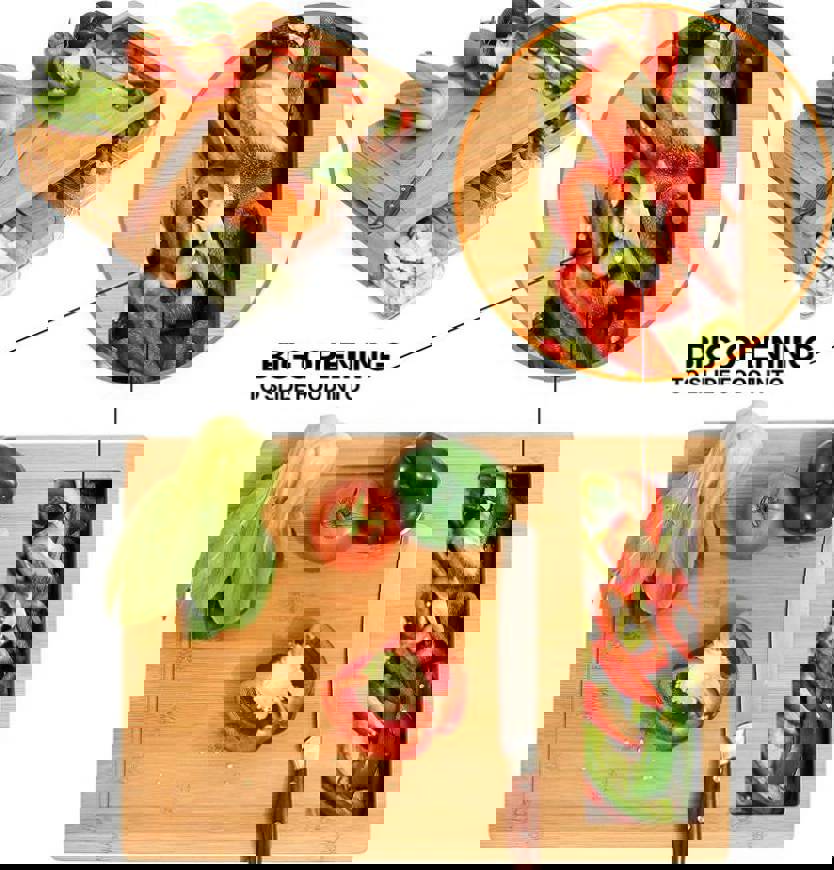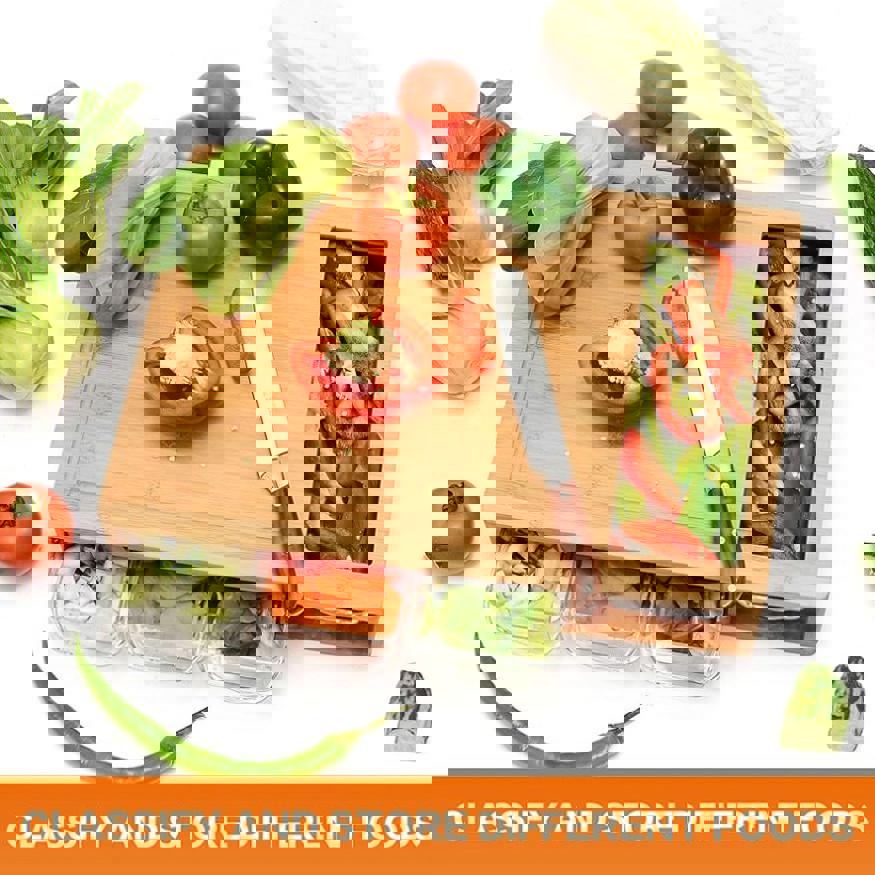 - EASY TO ORGANIZE AND COLLECT: This chopping board comes with 4 PET organizer trays, which are durable, light and easy to move. The cutting board also features integrated juice grooves to catch any excess juices and dripping from spilling onto your counter or table.