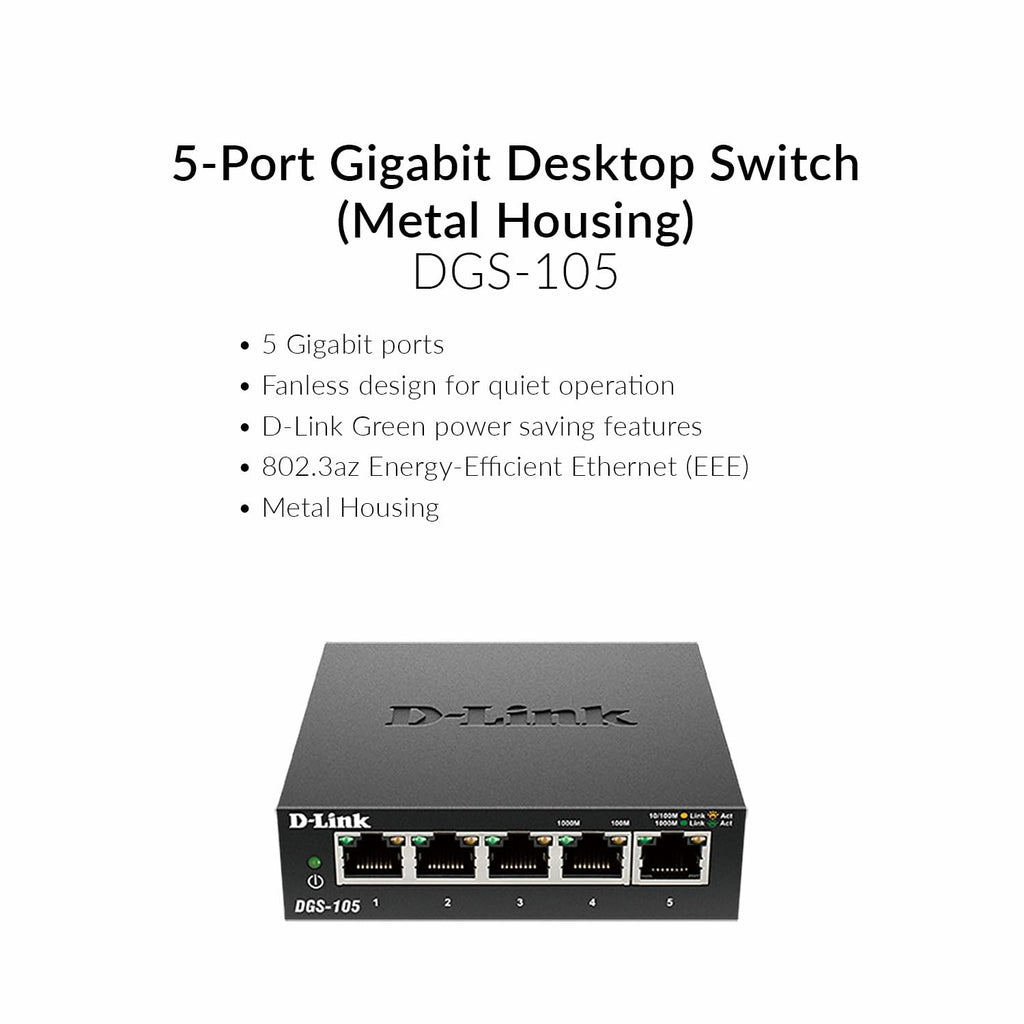 - Energy-Efficient and Quiet Operation - The DLink DGS-105 5 port Gigabit Unmanaged Switch is designed with green technology, featuring 802.3az Energy-Efficient Ethernet (EEE) and D-Link Green power saving features. These eco-friendly features help conserve energy and reduce your overall power consumption, while the fanless design ensures quiet operation, making it ideal for noise-sensitive environments.