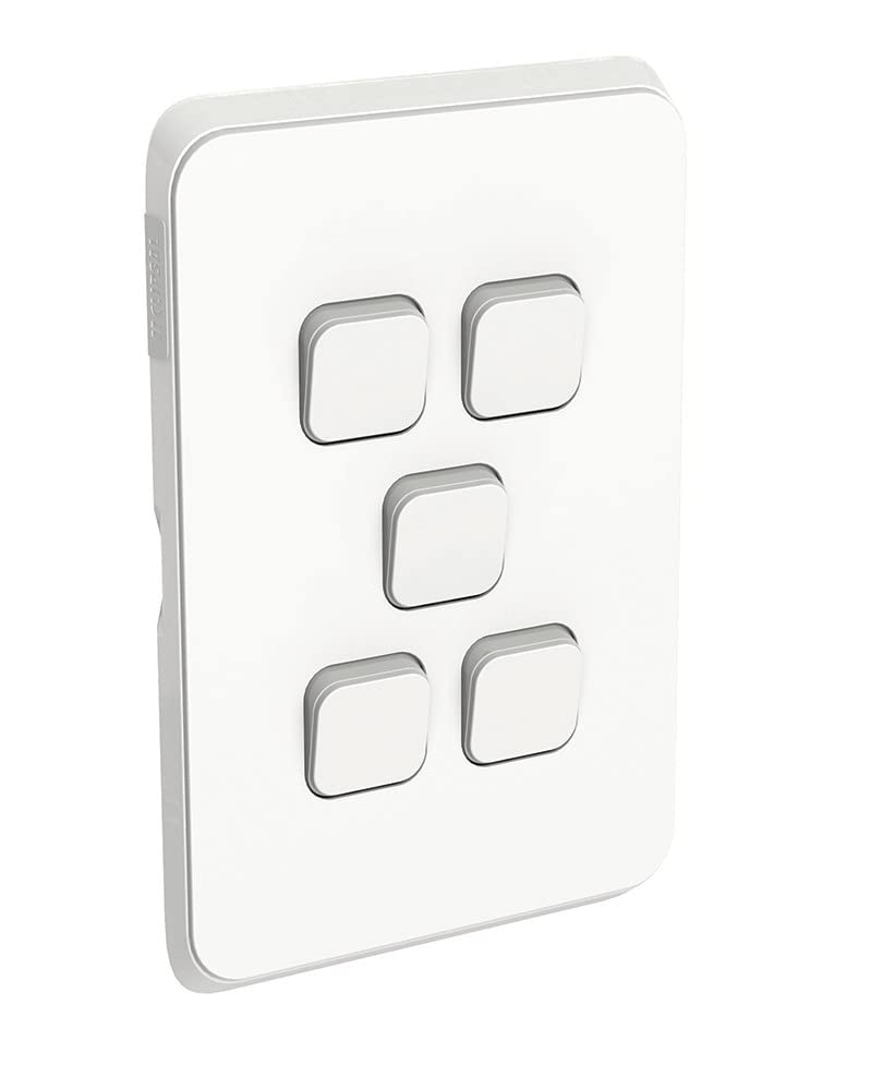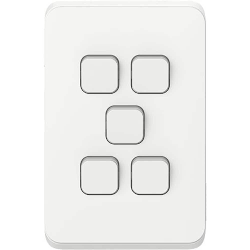 Clipsal by Schneider Electric Iconic 5 Gang 1-Way/2-Way Flush Switch is a 5-gang switch designed for residential use. It features 2-way switching capabilities and the ability to customize with iconic dollies to indicate switch function in a classic vivid white. It is designed for the ultimate in practicality and functionality. Ensures everlasting reliability and enduring value. Offer a fusion of a well balanced design. Control type: rocker, Device mounting: flush, Installation direction: vertical, Switch function: 1-pole 1/2-way, Number of rocker: 5, Rated current: 10 A, rated operational voltage: 250 V.