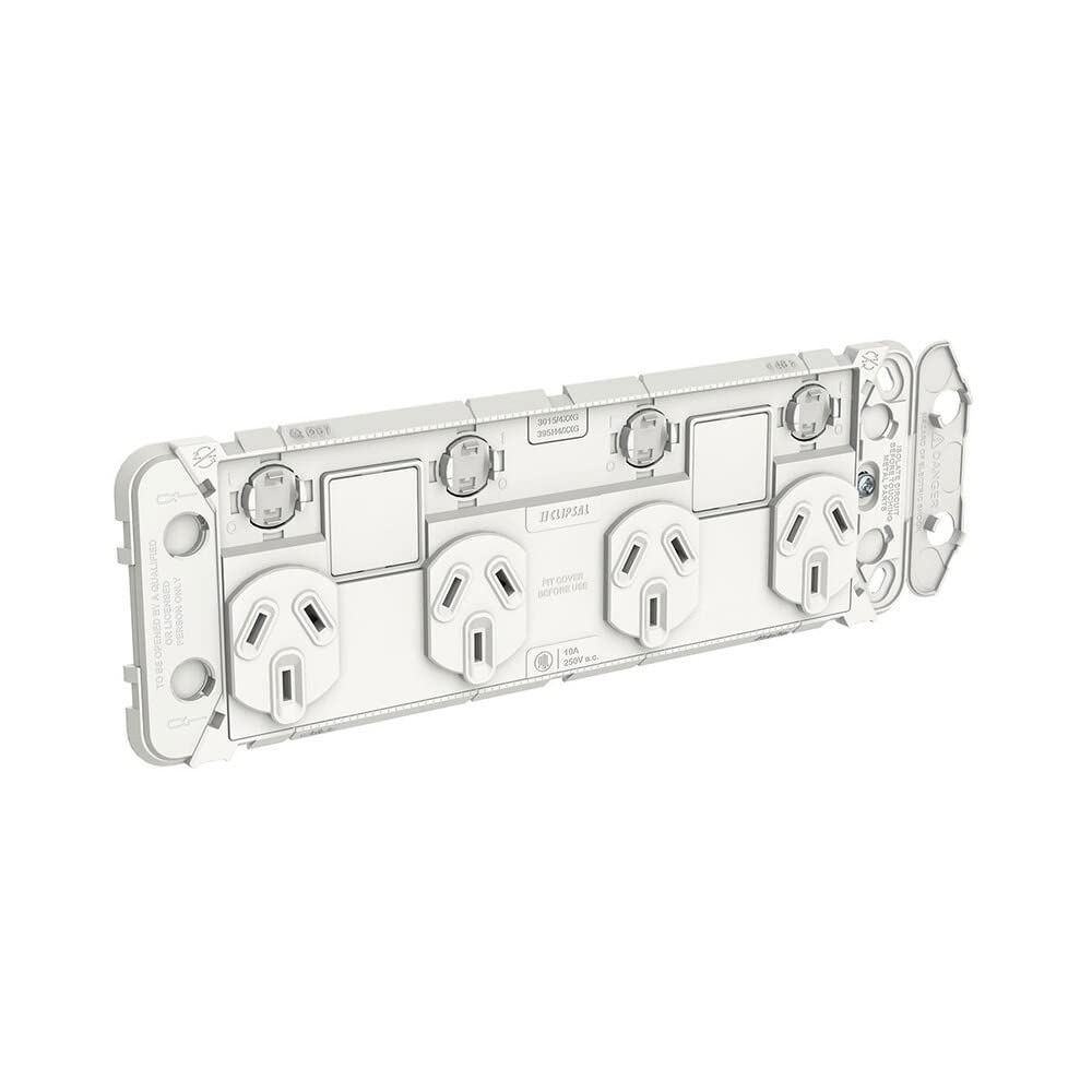 The Clipsal 10amp Iconic Quad power point grid features four switched outlets, as well as two additional switch provisions for lighting or exhaust fan controller. This grid only component is horizontally mounted and includes the mechanism with fixing frame.