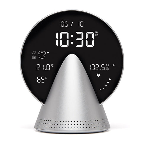Lexon Conic Radio Alarm Clock With Fm Built-In Bluetooth Speaker - Alu Polish - This versatile radio alarm clock features an FM radio and a built-in Bluetooth speaker, allowing you to wake up to your favourite FM station, soothing melodies, or natural sounds. It boasts a large LCD display with adjustable brightness for optimal visibility and includes an indoor temperature and relative humidity display for added convenience. The touch controls provide easy access to Bluetooth and FM radio modes, as well as device settings. Rechargeable and powered by a USB-C cable (included), this clock is crafted from durable aluminium and ABS materials. It is suitable for branding through laser or pad printing.