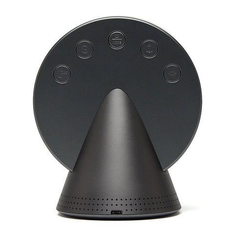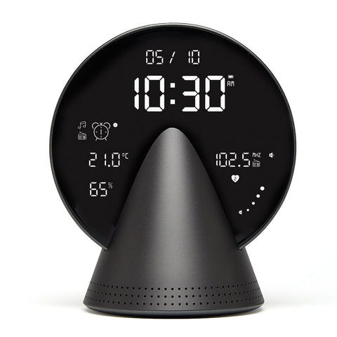 Lexon Conic Radio Alarm Clock With Fm Built-In Bluetooth Speaker - Grey - This versatile radio alarm clock features an FM radio and a built-in Bluetooth speaker, allowing you to wake up to your favourite FM station, soothing melodies, or natural sounds. It boasts a large LCD display with adjustable brightness for optimal visibility and includes an indoor temperature and relative humidity display for added convenience. The touch controls provide easy access to Bluetooth and FM radio modes, as well as device settings. Rechargeable and powered by a USB-C cable (included), this clock is crafted from durable aluminium and ABS materials. It is suitable for branding through laser or pad printing.