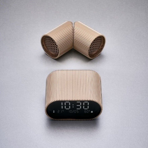Lexon Ray Clock Lcd Alarm Clock With Temperature / Humidity Display - Gold - Discover Ray Clock alarm clock, the essential companion for gentle awakenings and peaceful nights. Equipped with a pure black VA LCD screen ensuring clear visibility at all times, ambient temperature and humidity sensors, it displays useful information for your daily well-being. Designed to be easy to use, simply tilt the alarm clock on its base to disable it and upright it to activate it. Ray Clock offers a wide choice of melodies and natural sounds to wake you up gently. Its night mode allows you to sleep peacefully, without being disturbed by the light of the screen. Ray Clock features a minimalist and elegant design, with its case made entirely of aluminum with unique stripes which will bring a touch of modernity to your room. Available in many colours, it will fit harmoniously into your interior. Offering up to 6 months of battery life, Ray Clock is rechargeable via USB-C. Say goodbye to the hassle of dead batteries! You can rely on your alarm clock to accompany you for several months without worrying about frequent recharging.