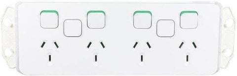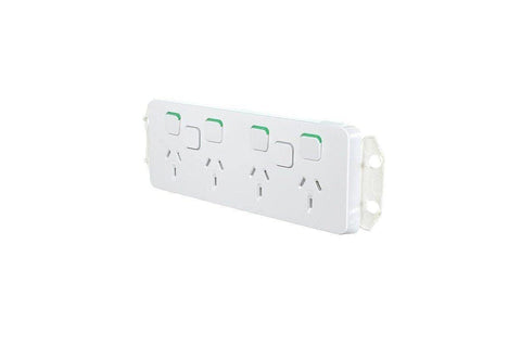 Clipsal 10A 250V Quad PowerPoint Socket with 2 Extra Switches Less Mechanism is ideal for multiple power outlets within a specific area. Protective flaps help prevent direct access to the screws after installation. "Socket grids are safe when installed. All sockets come with internal shutters providing additional protection. Perfect for the smart home office or entertainment areas.