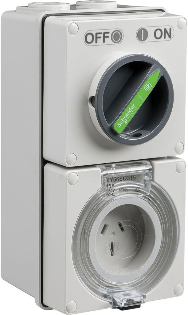 Schneider Electric Easy56 15A 250V 3 Pin Switched Socket with double-padlocking facility to ensure extra security. It features hinged flap on sockets to lock flaps into place and maintain IP ratings. Laser etched ON/OFF marking that wont wear off. Suitable for commercial and industrial uses. Specifications: Poles description: 1P + N + E, Control type: Rotary knob, rotary handle padlocking: 2 padlocks 8 mm, Network type: AC, Outlet standard: Australian/New Zealand, Cable cross section: 1.5-6 mm², cable entry number: 2 x M25/1 x M32, colour: Body: grey (RAL 7035), Rotary handle: dark grey.
