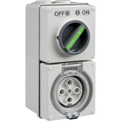 Schneider Electric Easy56 32A 500V 5 Pin Switched Socket with double-padlocking facility to ensure extra security. It features hinged flap on sockets to lock flaps into place and maintain IP ratings. Laser etched ON/OFF marking that wont wear off. Suitable for commercial and industrial uses. Specifications: Poles description: 3P + N + E, Control type: Rotary knob, rotary handle padlocking: 2 padlocks 8 mm, Network type: AC, Outlet standard: Australian/New Zealand, Cable cross section: 1-16 mm², cable entry number: 2 x M25/1 x M32, colour: Body: grey (RAL 7035), Rotary handle: dark grey.