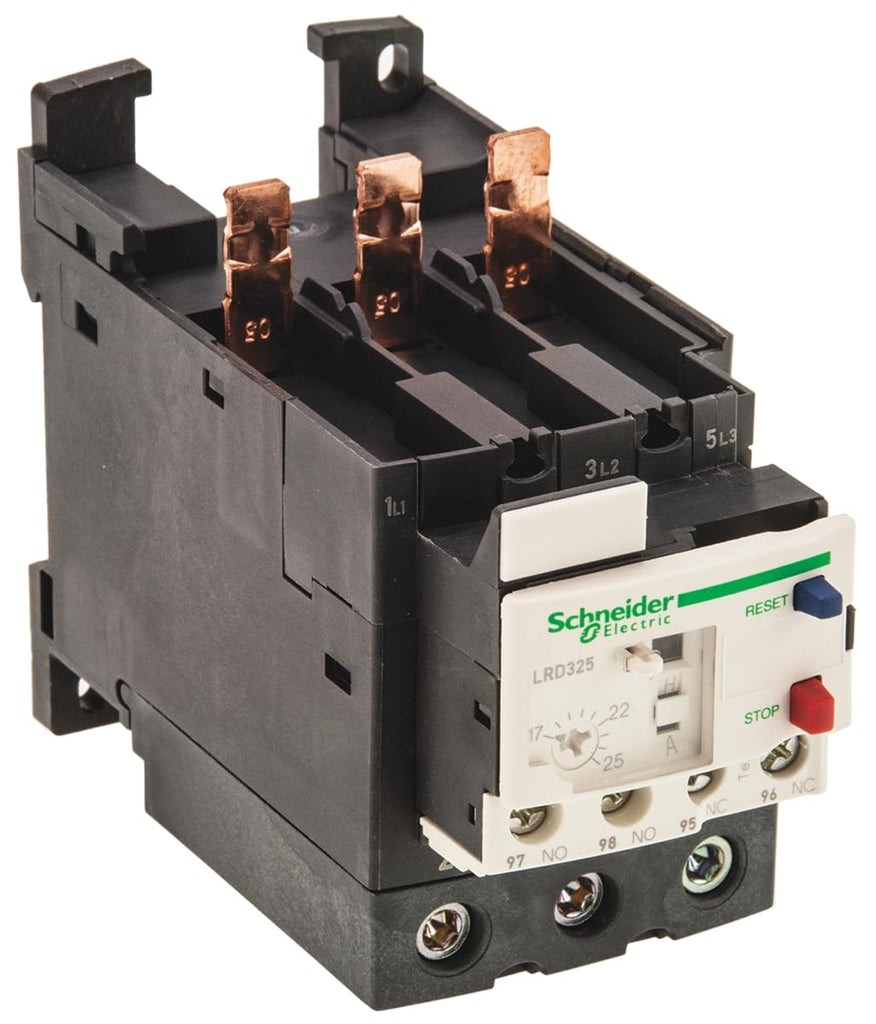 Schneider Electric TeSys LRD 17-25A Class 10A Thermal Overload Relays for protection of 3-phase motors 11kW@400V. Differential device with phase failure and load unbalance detection. It provides a thermal adjustment dial, a manual-automatic reset selector, a test selector for simulation of a tripping, reset and stop buttons, a flag indicator and 2 auxiliary contacts 1NO+1NC for fault signalling. Settings are protected by a transparent cover lockable by sealing. Connection by EverLink BTR screw terminals, it connects directly to the bottom terminals of 3-pole contactors LC1D40A-D80A.