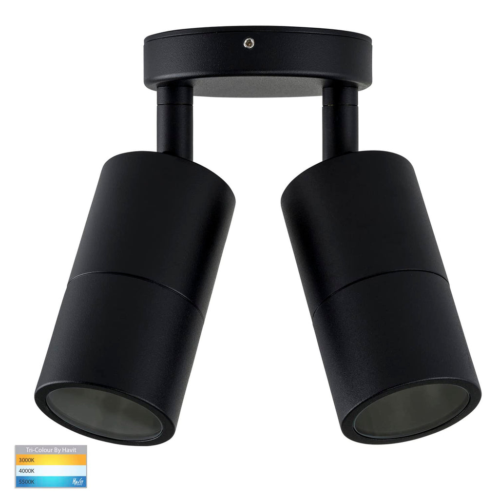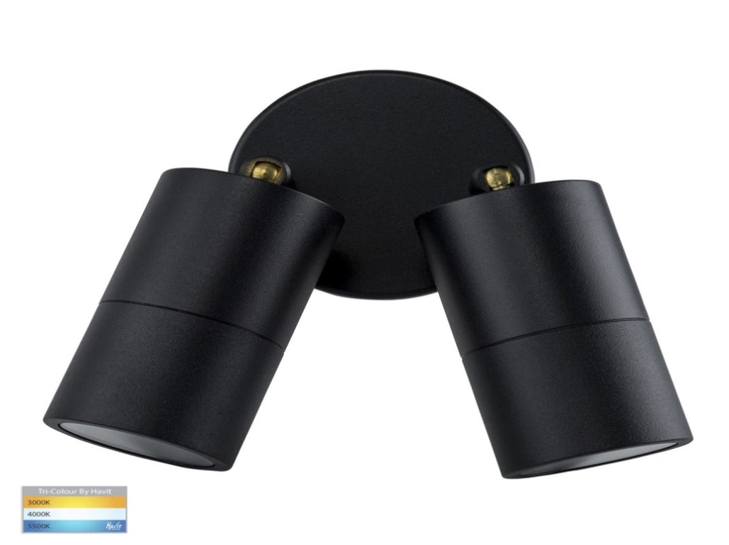 Havit Lighting Tivah Black 2 x 5W 240V GU10 LED Tri Colour Double Adjustable Wall Pillar Light has aluminium poly powder coated black body. It includes matching backing plate. Features high output reflector to maximise light. Designed to be mounted on walls and provide directional light to suit your home decor style and taste, creating a stunning atmosphere to your exterior area become more enjoyable, pleasant, while still providing safety and security.
