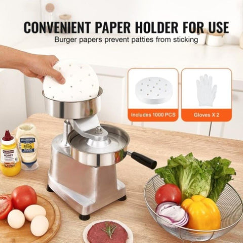 For your convenience, the hamburger patty press machine is equipped with a paper holder for quick access to burger papers. The side button on the body lowers the press plate, making operation easy and efficient. Additionally, it comes with 2 packs of burger papers totaling 1000 pcs and 2 pairs of gloves.