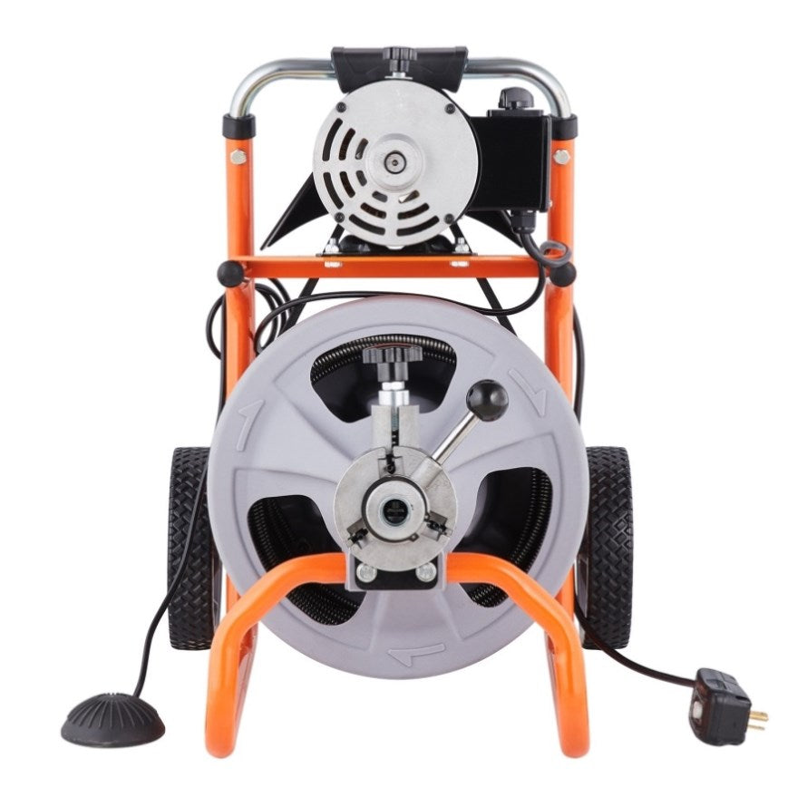 Our sewer drain auger features a semi-enclosed plastic drum that is durable, rust-resistant, and allows easy observation of cable length. It also includes a GFCI switch to prevent electric shock and tool hooks for cutters storage