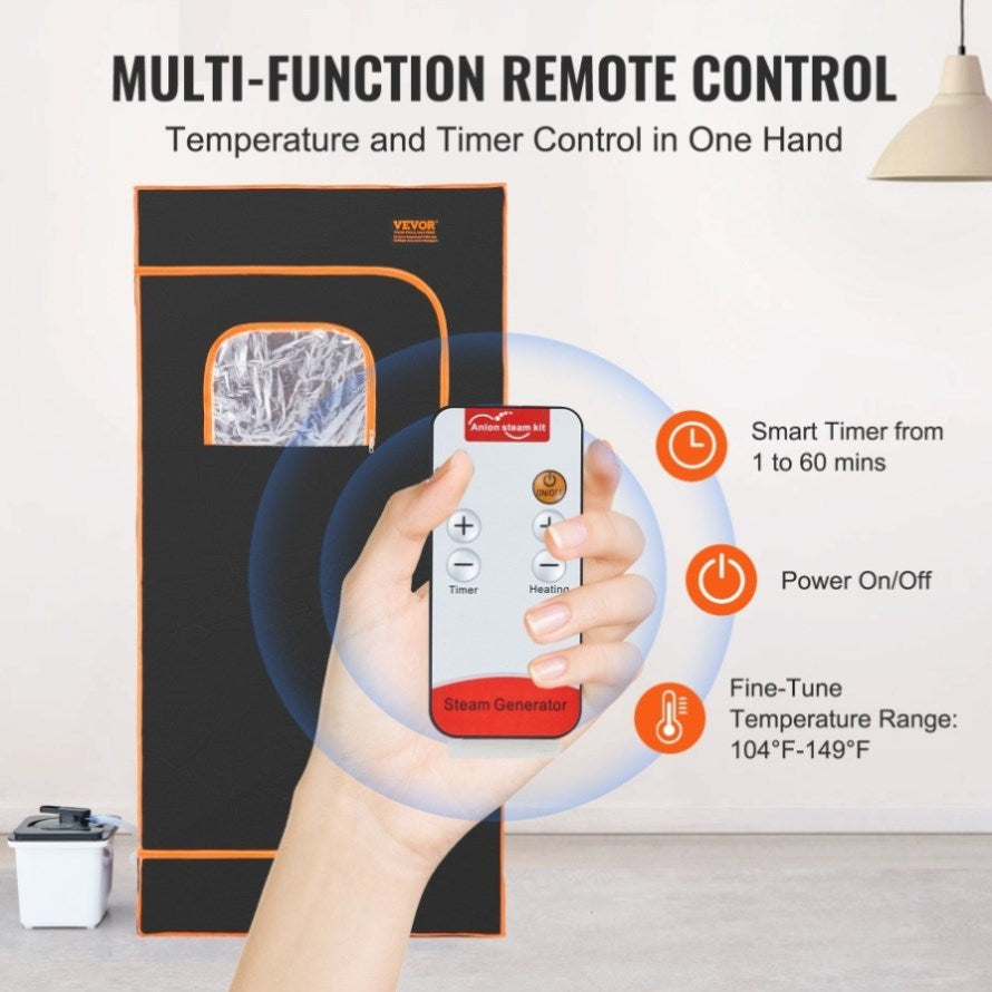 The multifunctional handheld remote features temperature control from 104_ to 149_ and an intelligent timer with settings from 1 to 120 minutes. Choose your preferred temperature and time to fully enjoy the sauna experience.