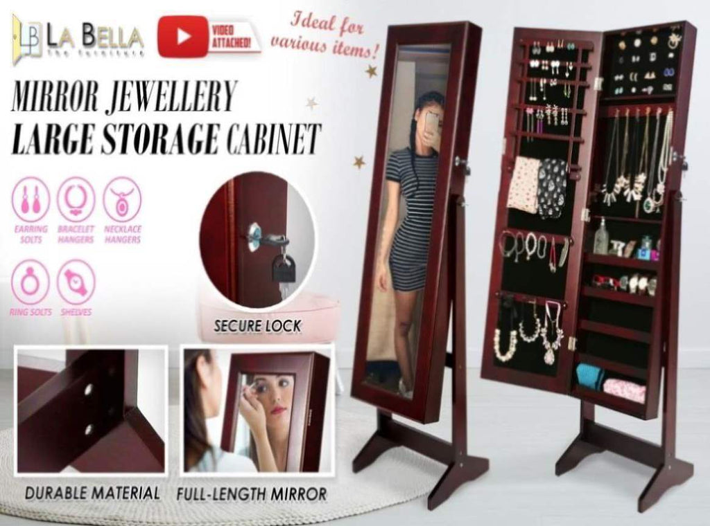 This high-quality La Bella LUVO Walnut Multifunctional Mirror Jewellery Lockable Cabinet is ideal for you if you need a compact and stylish storage option for your precious accessories! The mirror is a full-length dressing mirror so you can enjoy the convenience of having a mirror instantly available to check out how great your jewelleries fit with your dressing! It will blend in well in any room and this is for sure a great solution if you want to keep your jewelleries and room tidy.