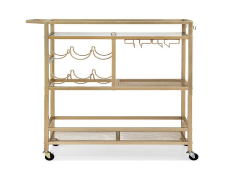 Transform your space with this versatile gold bar cart. Featuring mirrored tempered glass shelves, a durable gold metal frame, and a waterproof surface, this cart is both elegant and practical. The removable wine racks and glass holders make it perfect for entertaining, while the gallery rail ensures safety for your items. Bonus 3 hooks provide extra hanging options for towels or utensils. With 4 universal casters (2 lockable) and a convenient push bar that doubles as a towel rack, this cart is easy to move and secure. Whether used as a kitchen island, bar cart, or serving trolley, it's ideal for any occasion. Assembly is quick and straightforward with clear instructions included. Perfect for hosting and daily convenience!