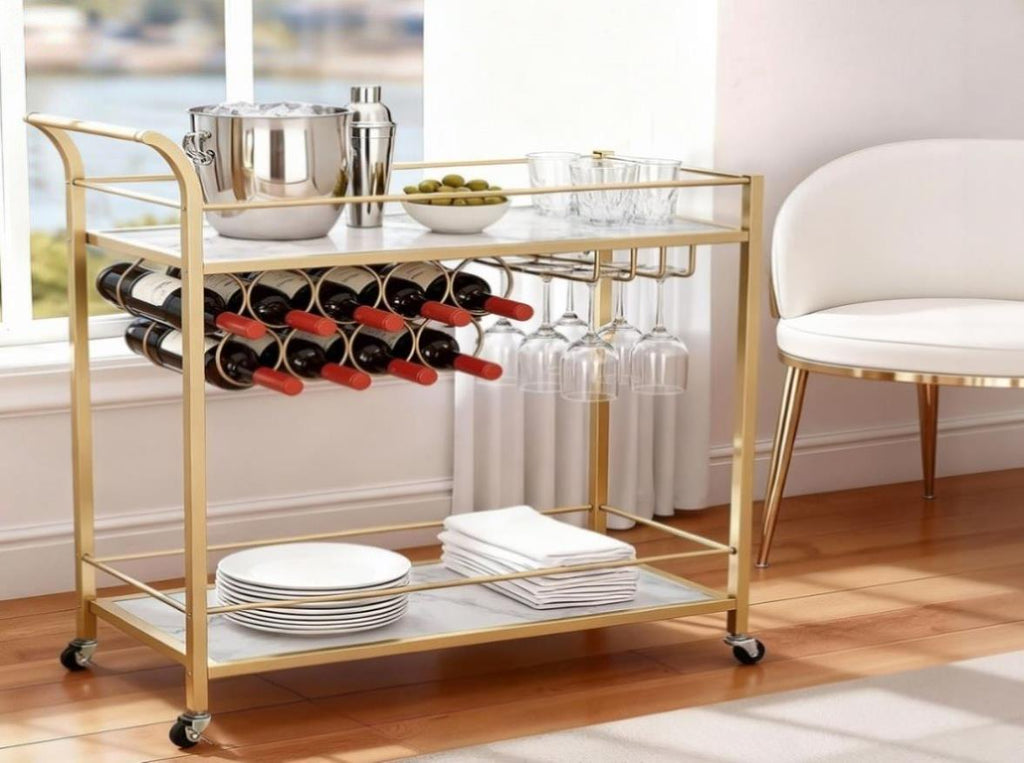 Add elegance and functionality to your space with our versatile marble bar cart. Make entertaining or daily meal prep easier with this stunning rolling kitchen island cart. Featuring marble-effect shelves and a durable gold frame, this cart combines style and practicality. Removable wine racks and glass holders ensure your beverages and glassware are always within reach. The ample storage includes a gallery rail for secure organisation. Four universal casters allow easy movement, with two lockable for stability. Its curved push bar doubles as a towel rack, adding convenience. The water-resistant surface ensures effortless cleaning, making it perfect for kitchens, dining rooms, or even as a bar cart for entertaining. Clear instructions make assembly a breeze. Elevate your space today with this elegant and functional cart!