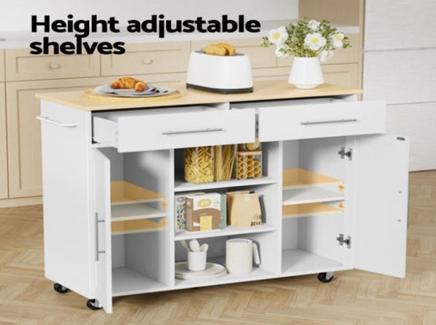 Maximize your kitchen space with the Artiss Kitchen Island Cart, designed for both storage and versatility. Crafted from durable MDF, this sturdy cart features 2 spacious drawers, 2 storage cabinets (with adjustable shelf), and 3 open shelvesperfect for organizing cookware, pantry items, or bar essentials. The convenient towel rack doubles as a push bar for easy maneuvering.