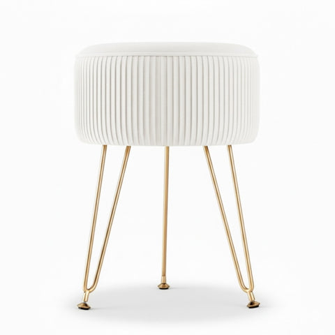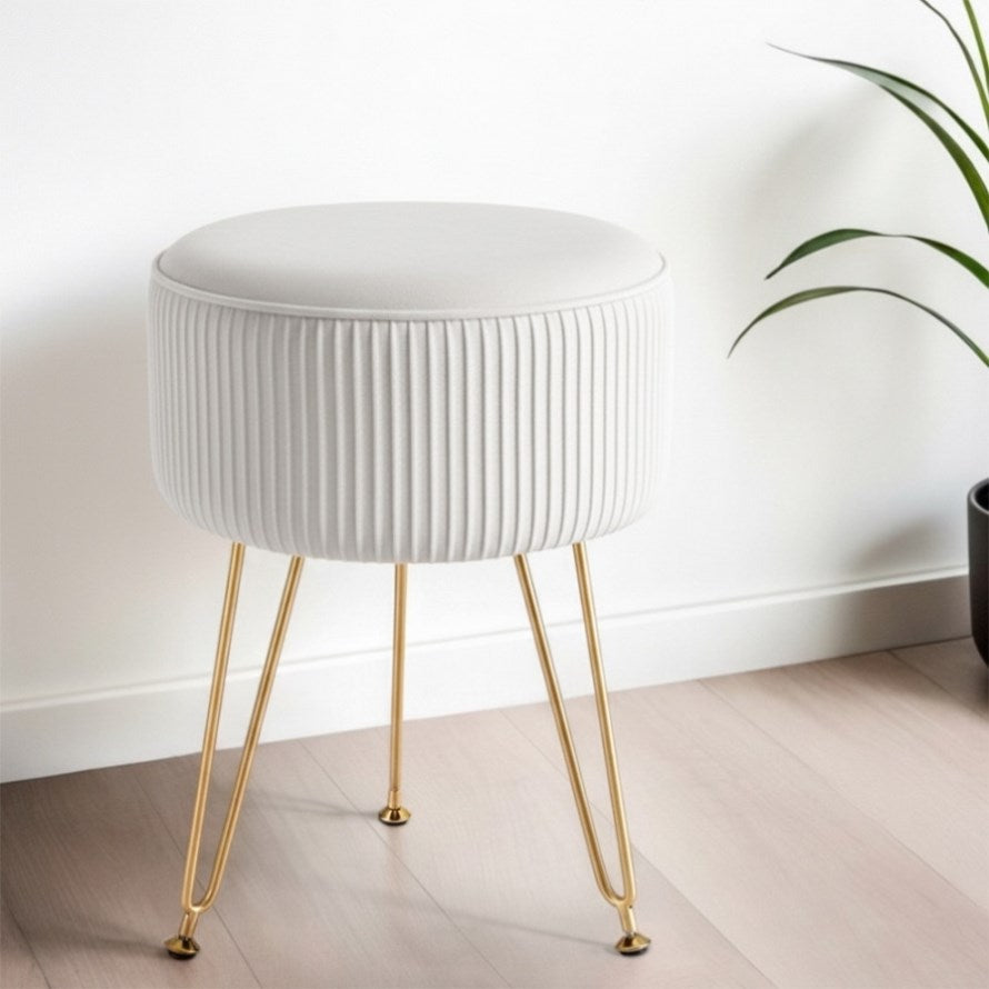 Round velvet Artiss footstool with vertical stripe design, durable MDF frame, and high-resilience foam padding. Features protective metal legs and simple assembly.