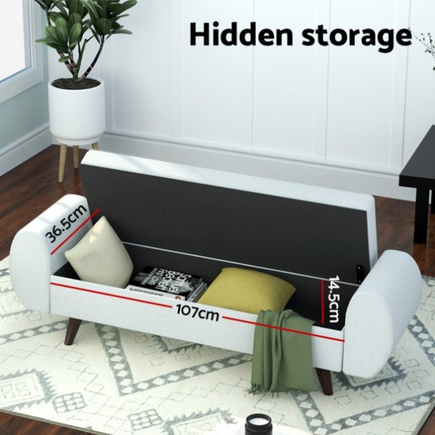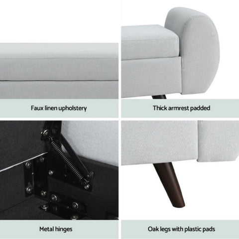 This Artiss storage ottoman features an armrest, faux linen upholstery, and a sturdy plywood and MDF frame. It boasts high-resilience foam padding, ample storage space, metal hinges, oak legs with plastic feet, and is simple to assemble.