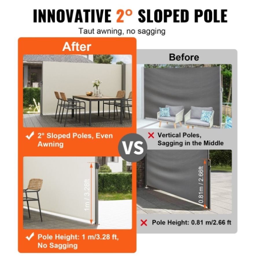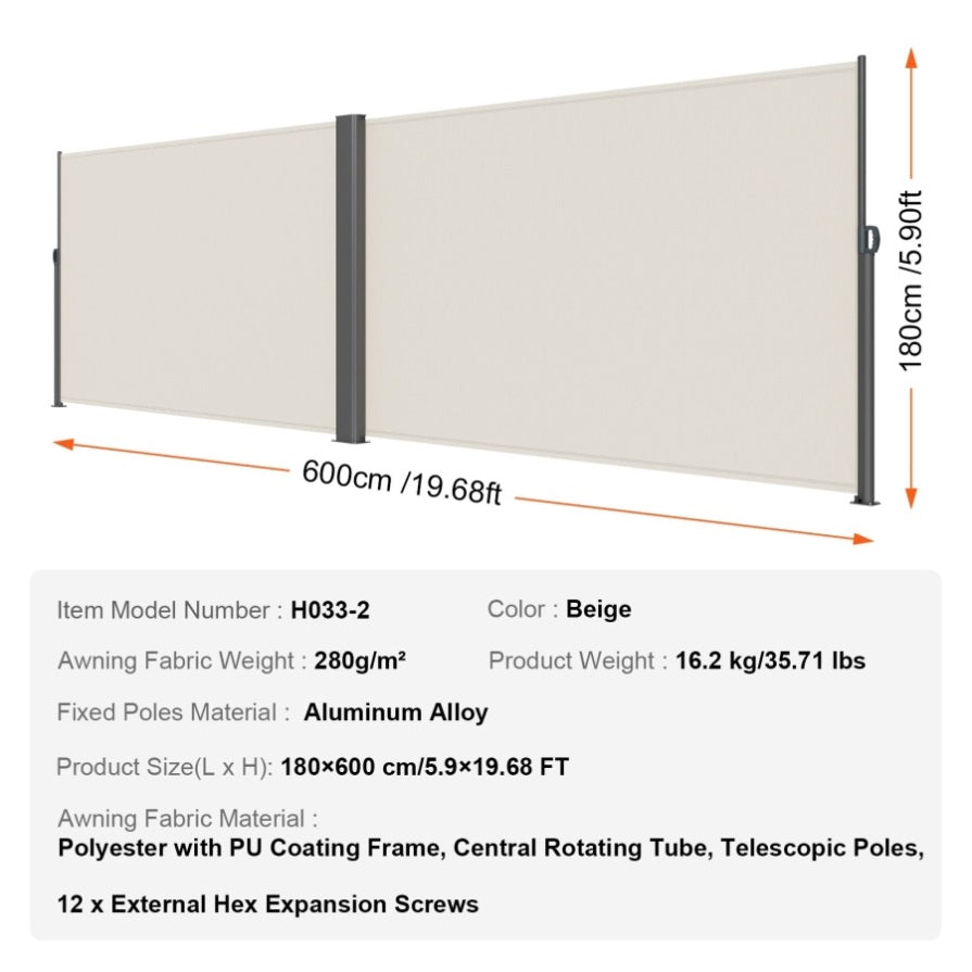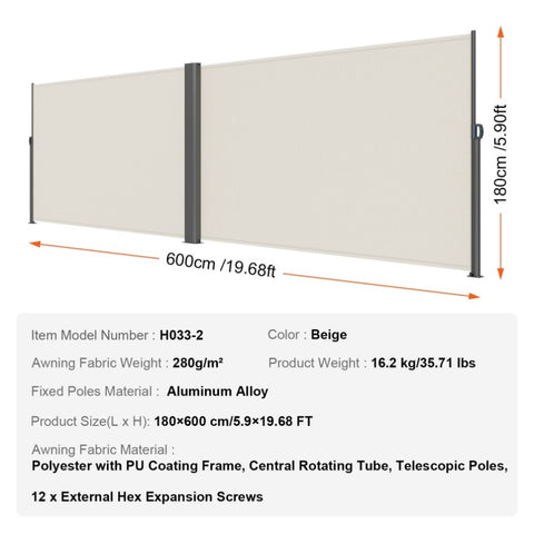 VEVOR Side Awning, 180X600cm Aluminum Outdoor Privacy Screen, 280g Polyester Water-proof V952-ZYPF180X600CMM001V0