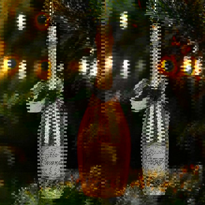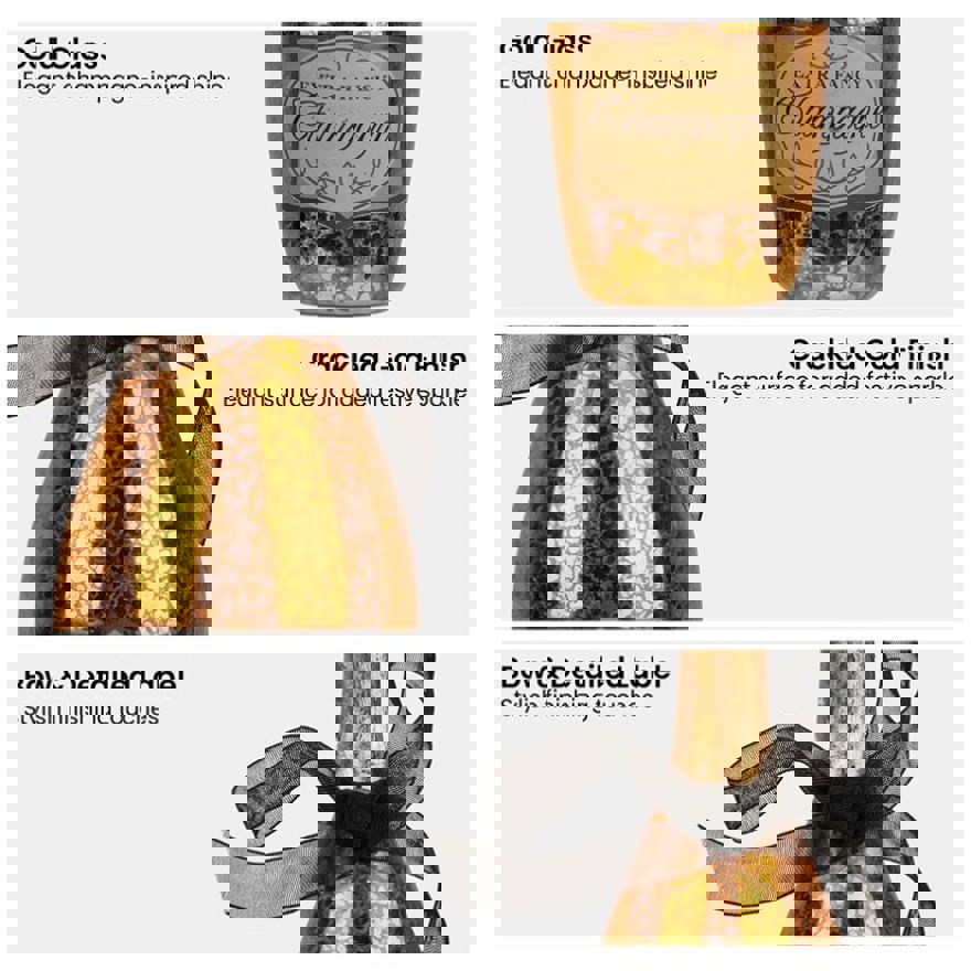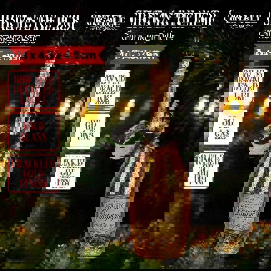 Pop some sparkle onto your tree! This pack of 6 Champagne bottle decorations is crafted from gold glass with a crackled finish for an elegant shine. Each ornament is topped with a sleek black bow and features a detailed label, making them a festive and stylish touch for Christmas trees, wreaths or holiday displays.