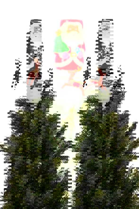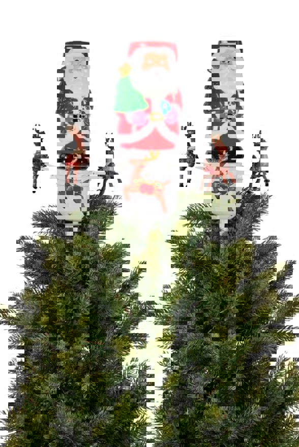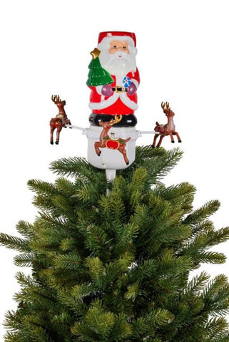 This captivating Christmas tree topper combines the charm of Santa and reindeer with mesmerizing features that will fill your space with joy and wonder. Santa Claus takes center stage with internal lights and is surrounded by a rotating band of reindeer gracefully moving in a circular motion, adding a touch of whimsy to your tree.