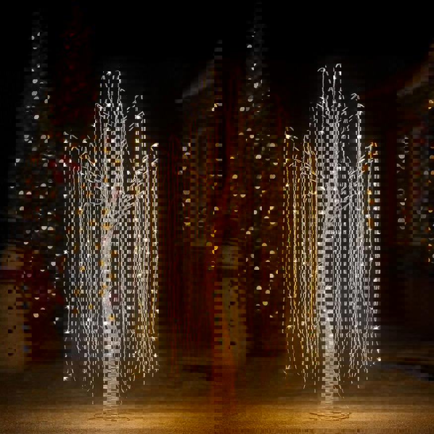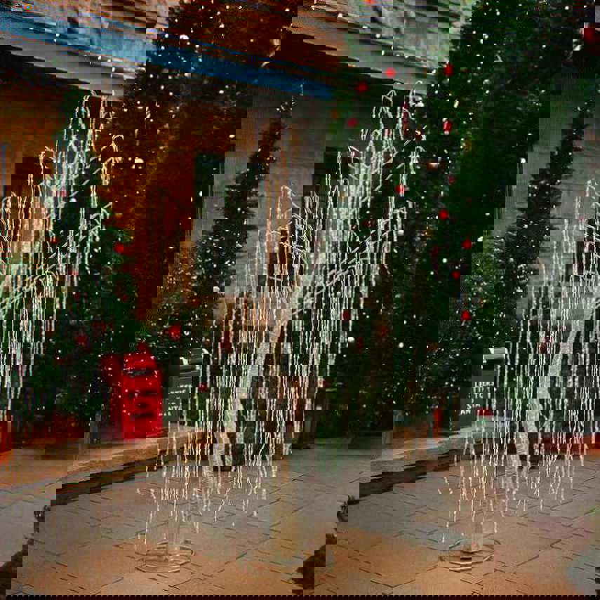Turn up the sparkle with this 120cm silver willow tree, designed to dazzle all season long. Its flexible branches are draped with shimmering metallic strands and lit by warm white LED lights for a soft golden glow. With an eye-catching silver finish and graceful silhouette, it makes a stunning statement indoors or outdoors under cover, whether as a floor feature or a table-top display.