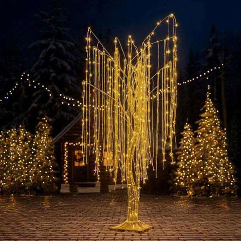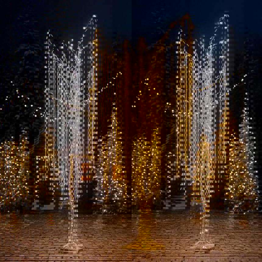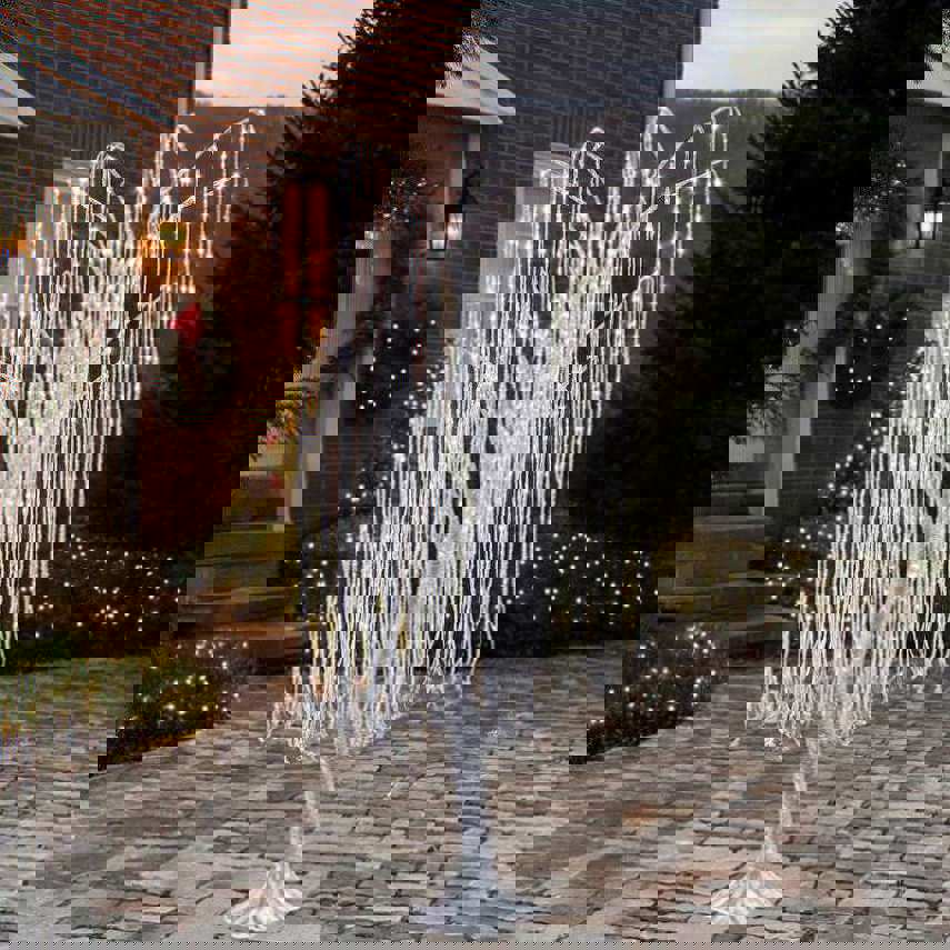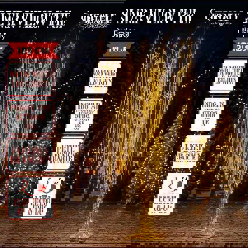 Turn up the sparkle with this 180cm silver willow tree, designed to dazzle all season long. Its flexible branches are draped with shimmering metallic strands and lit by warm white LED lights for a soft golden glow. With an eye-catching silver finish and graceful silhouette, it makes a stunning statement indoors or outdoors under cover, whether as a floor feature or a table-top display.