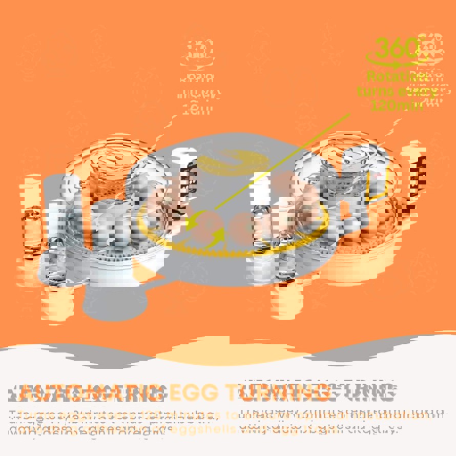 • Automatic Egg Turning: Turns eggs every 120 minutes to ensure optimal incubation, avoiding adhesion of eggshells and egg trays.