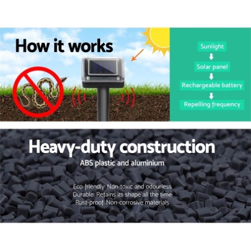 Suitable for your garden, yard, farm and orchard, these snake repellers are powered by a rechargeable NI-MH battery which is charged by a solar panel, enabling a full operating all night.