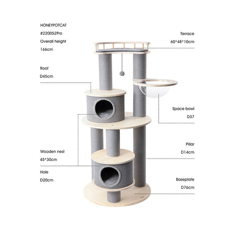 HONEYPOTCAT Majestic Reinforced Multi-Level Cat Tree blends modern and vintage design elements, featuring quality coatings from Huarun that meet the new national standard E0 formaldehyde emission ≤ 0.5mg/L. Its oversized base provides stable support, ensuring even large cats can play safely. The crescent-shaped semi-enclosed platform is both spacious and elegant, offering a comfortable resting area for your feline friends. The structure is not only stable and resistant to deformation but also odor-free, doesnt attract cat hair, and is pest-resistant, creating a safe and hygienic environment for cats to fully enjoy their lives.