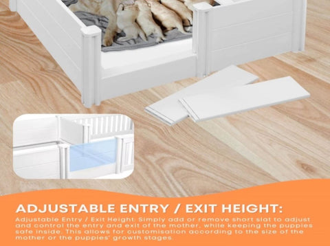 Ensure a safe, hygienic, and comfortable space for mothers and puppies with our Rooster Farms Deluxe PVC Whelping Box and Playpen Kit. Made from durable, non-porous PVC, it is easy to clean, UV-stable, and built to last. The box features integrated anti-crush rails to protect puppies, and adjustable entry slats that let mum in and out while keeping puppies secure. A connected playpen provides extra space for puppies to explore safely. Flat-packed for quick tool-free assembly, the modular panels and connectors make it simple to set up or store. Ideal for breeders or pet owners preparing for new arrivals.