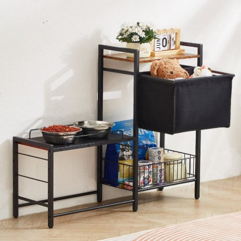 This feeding station with a storage function and a dog bowl stand, offers ample space for dog food, treats, toys, clothes, decorations, and other essentials. Its minimalist design complements various home spaces, making it suitable for use as a storage rack in the living room, bedroom, or kitchen.